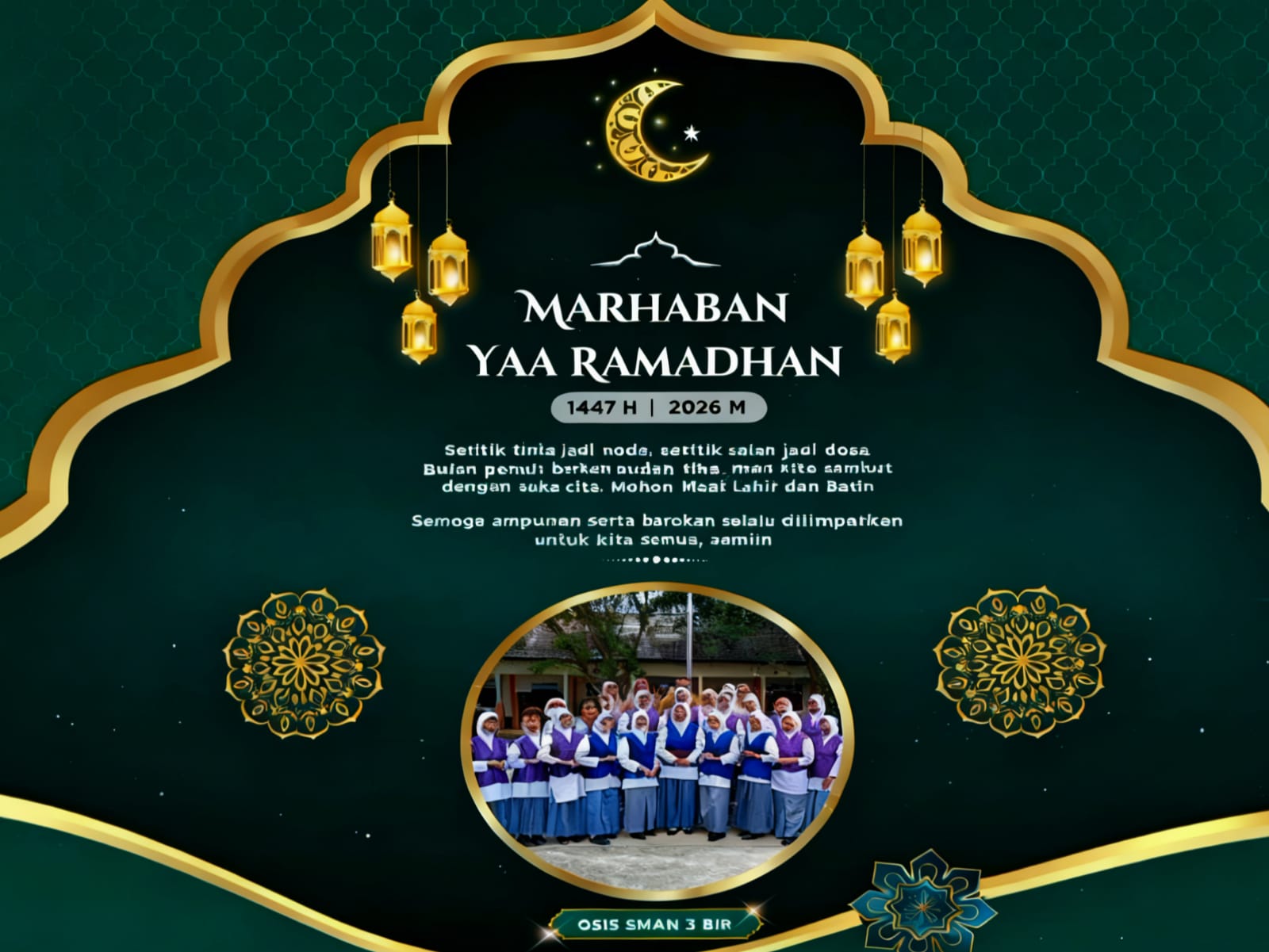 SMA Negeri 3 Bireuen melalui Organisasi Siswa Intra Sekolah (OSIS) mengucapkan selamat menyambut bulan suci Ramadhan 1447 Hijriah/2026 Masehi, dengan penuh kebahagiaan dan harapan yang mendalam.